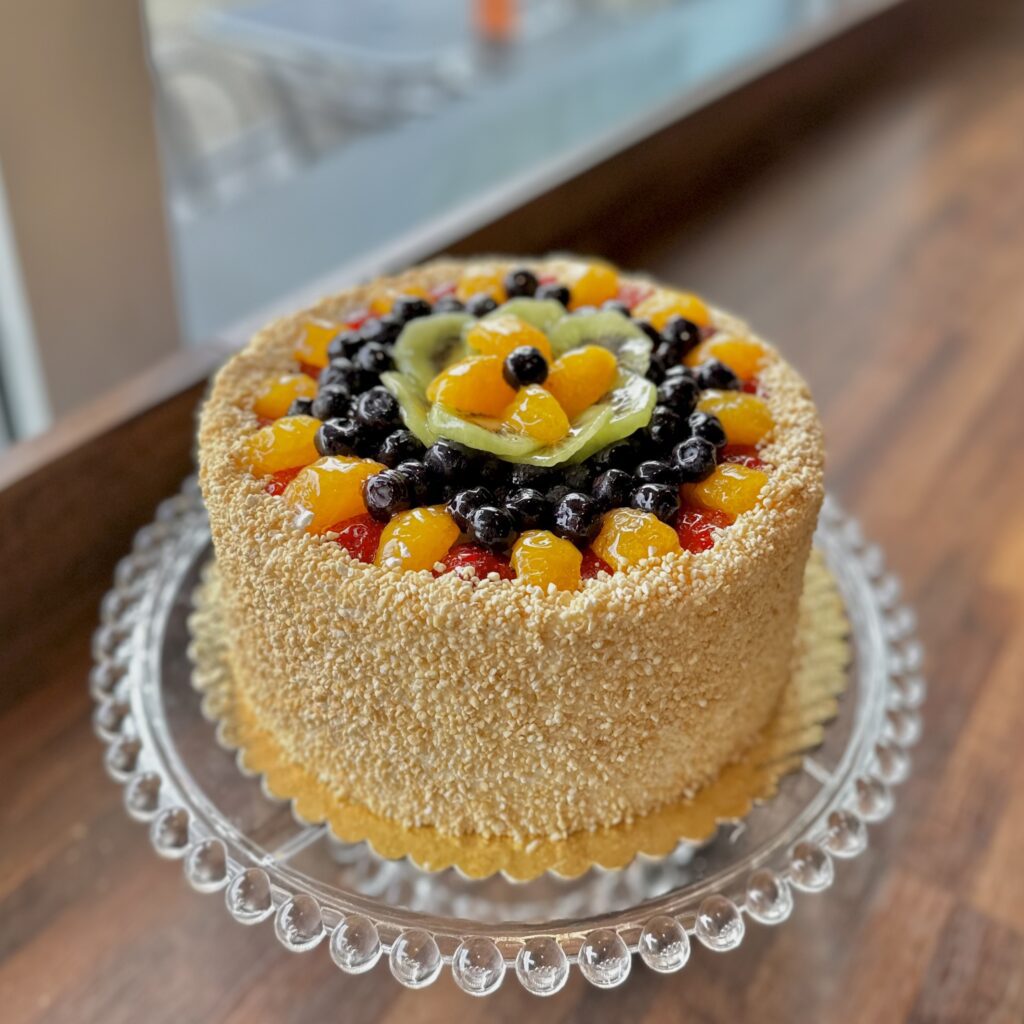 A stunning fruit arrangement as the finishing touch. Sponge cake filled with Bavarian cream and whipped cream, iced with whipped cream, coated with croquant (sweetened puffed rice), and topped with seasonal fruit.