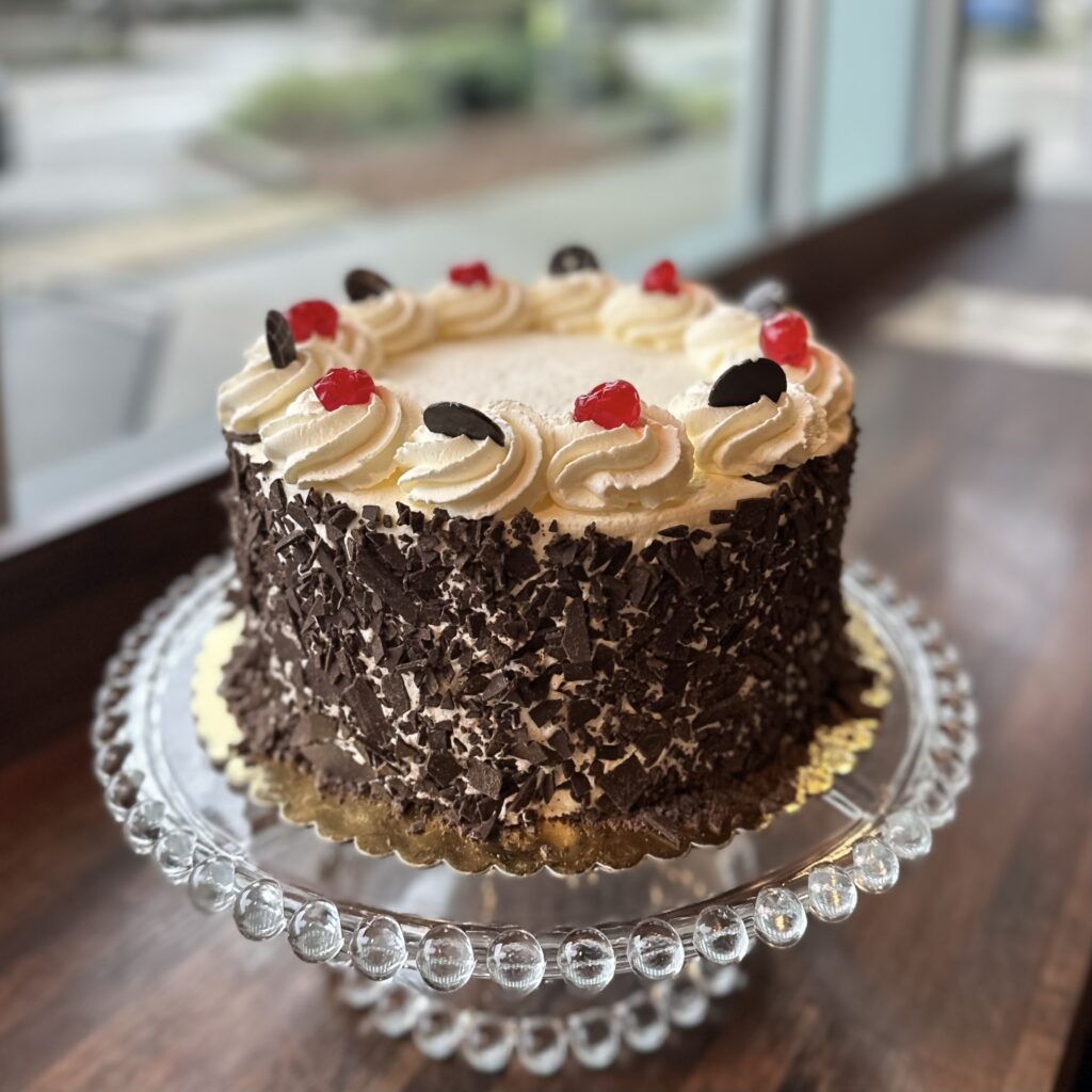An outstanding representation of this flavor combination. Chocolate cake filled with chocolate mousse and cherries, iced with whipped cream and coated with dark chocolate shavings.